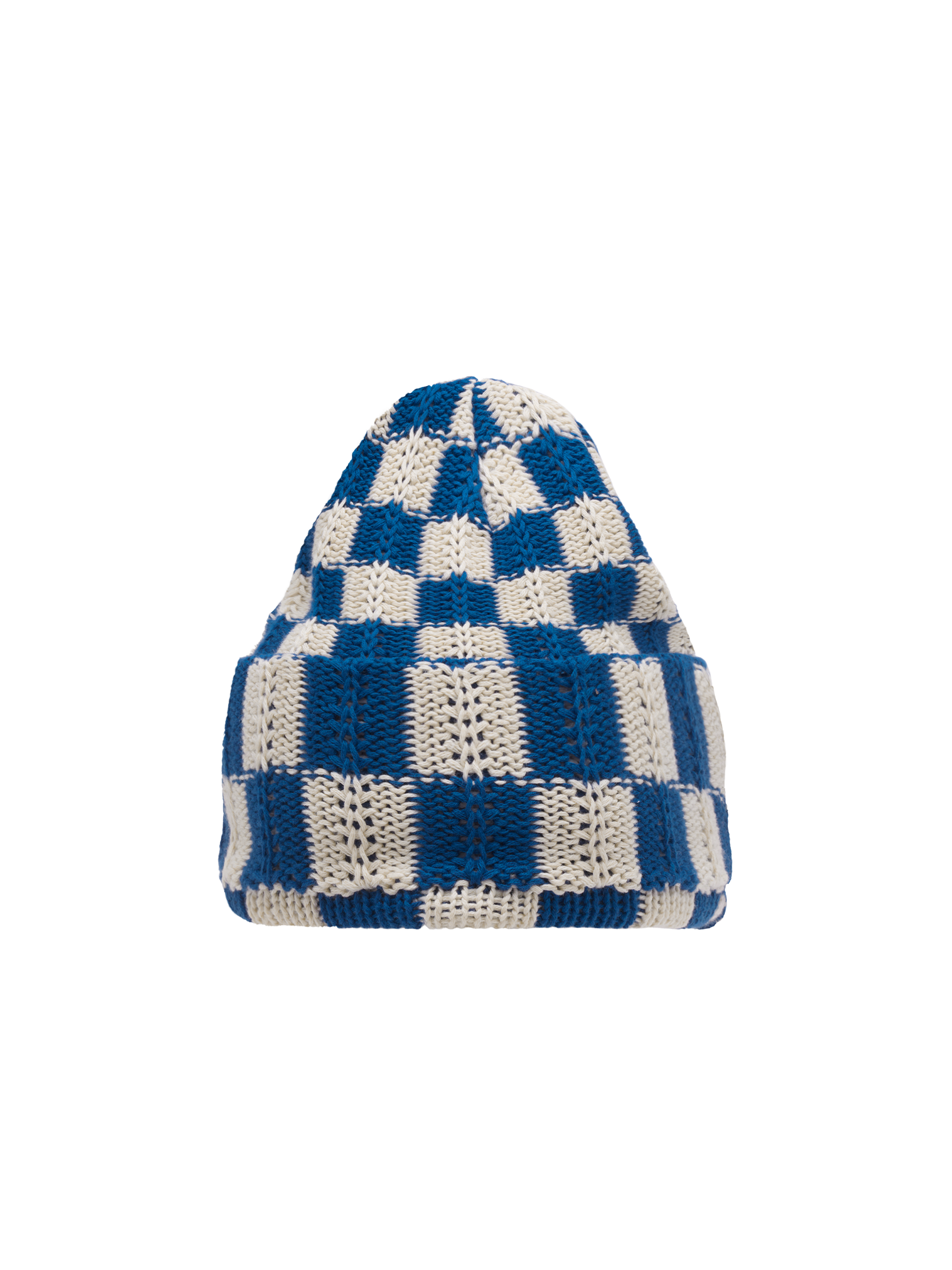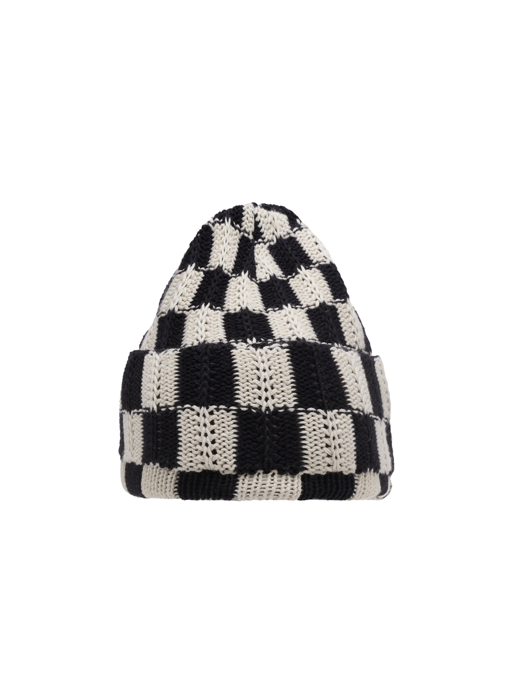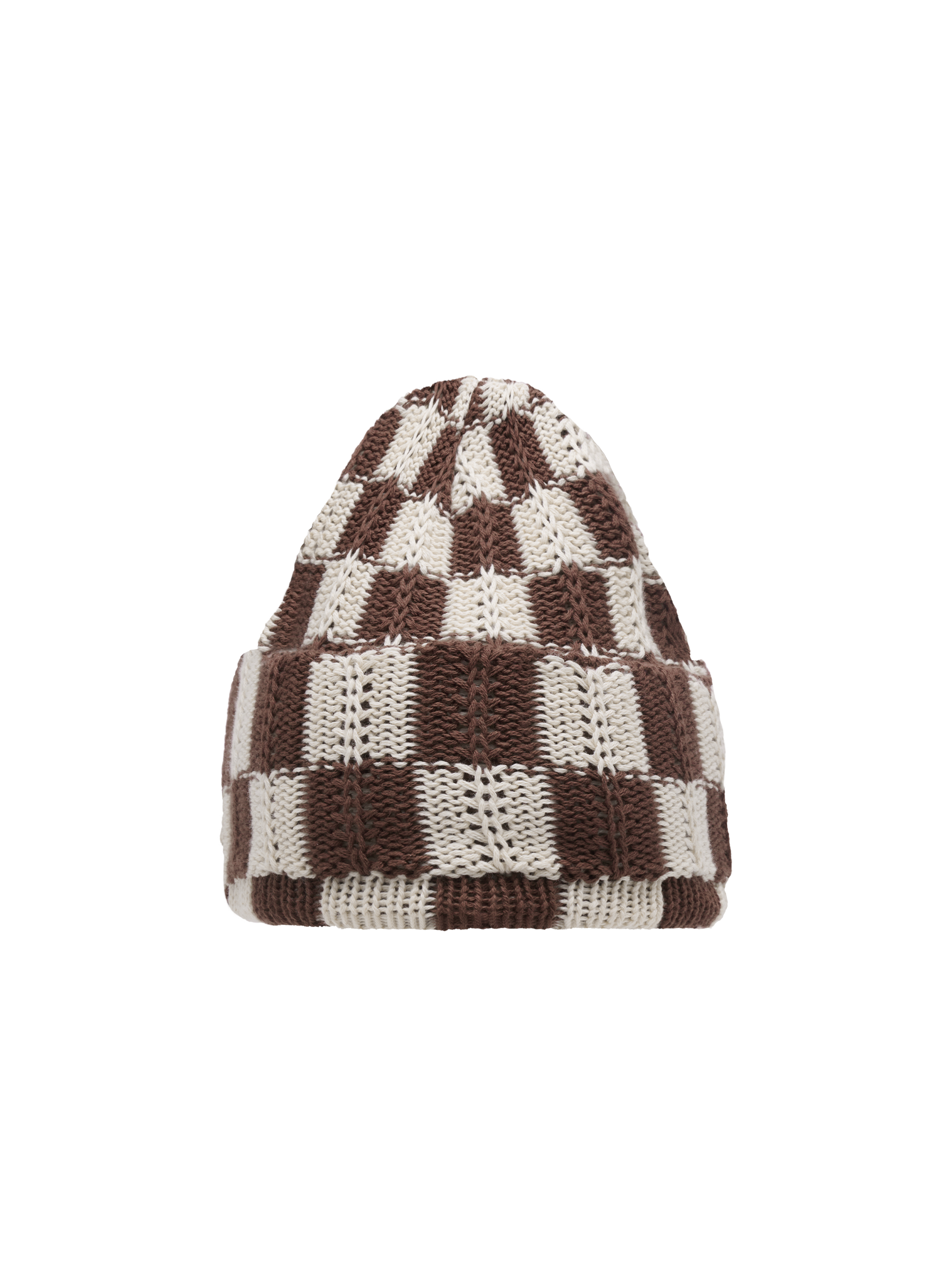 Gestrickte Checkerboard-Beanie. Schwarz/Weiß. Braun/Weiß. Navy/Weiß.