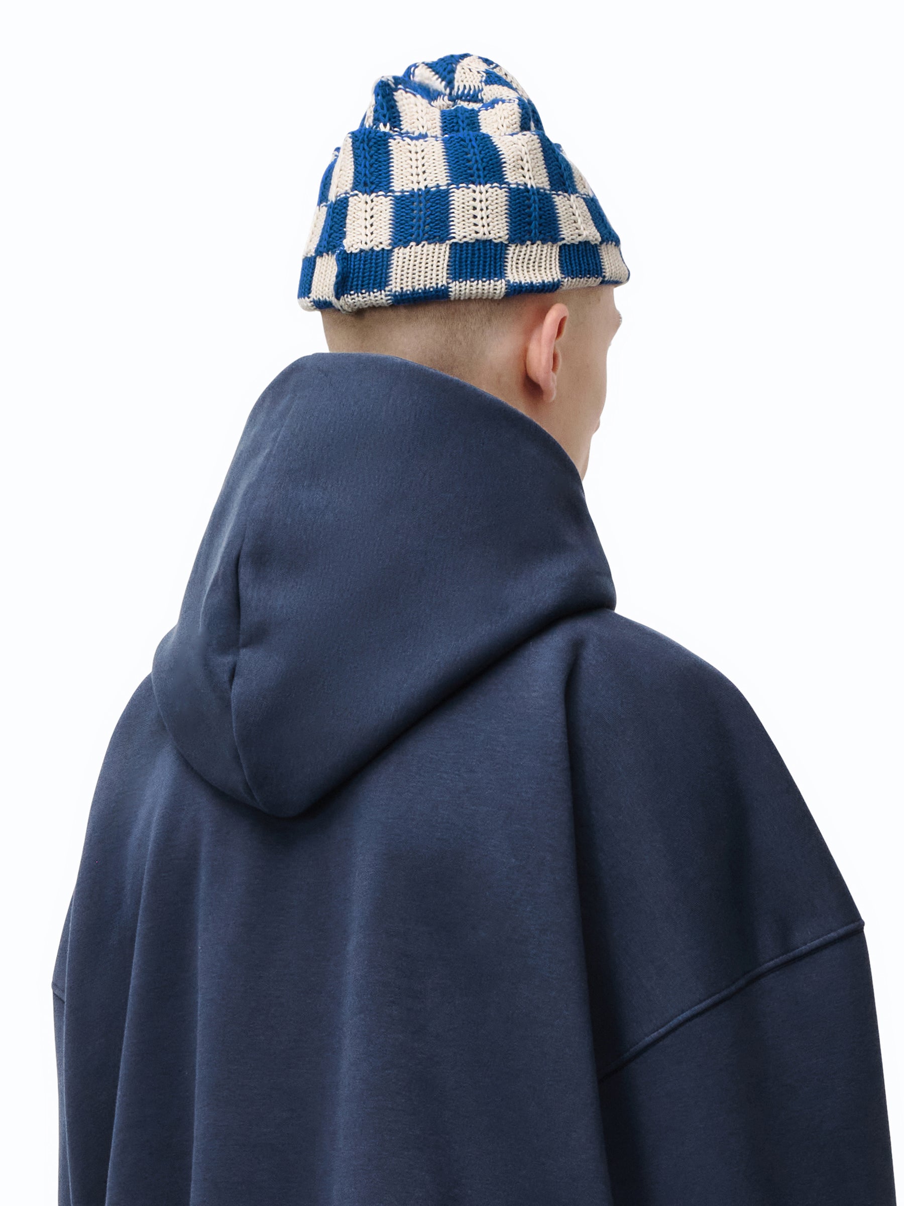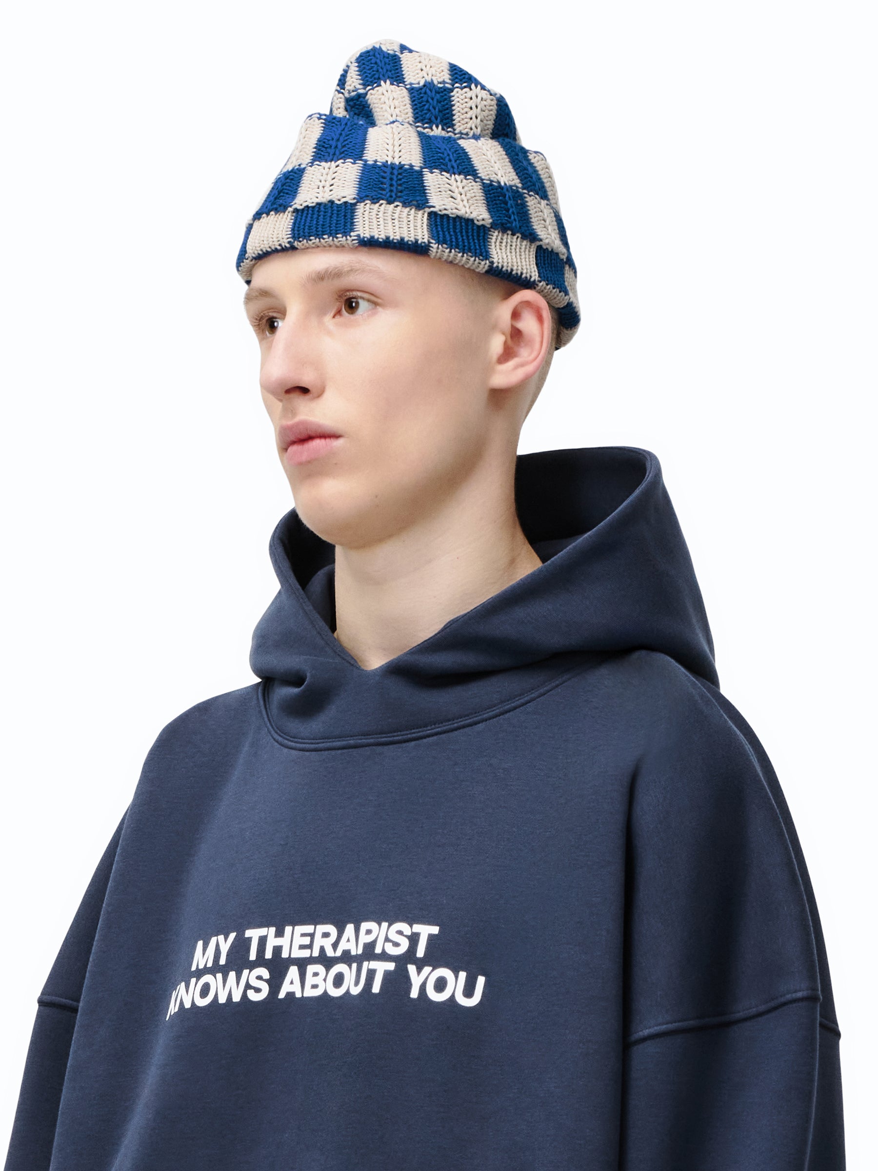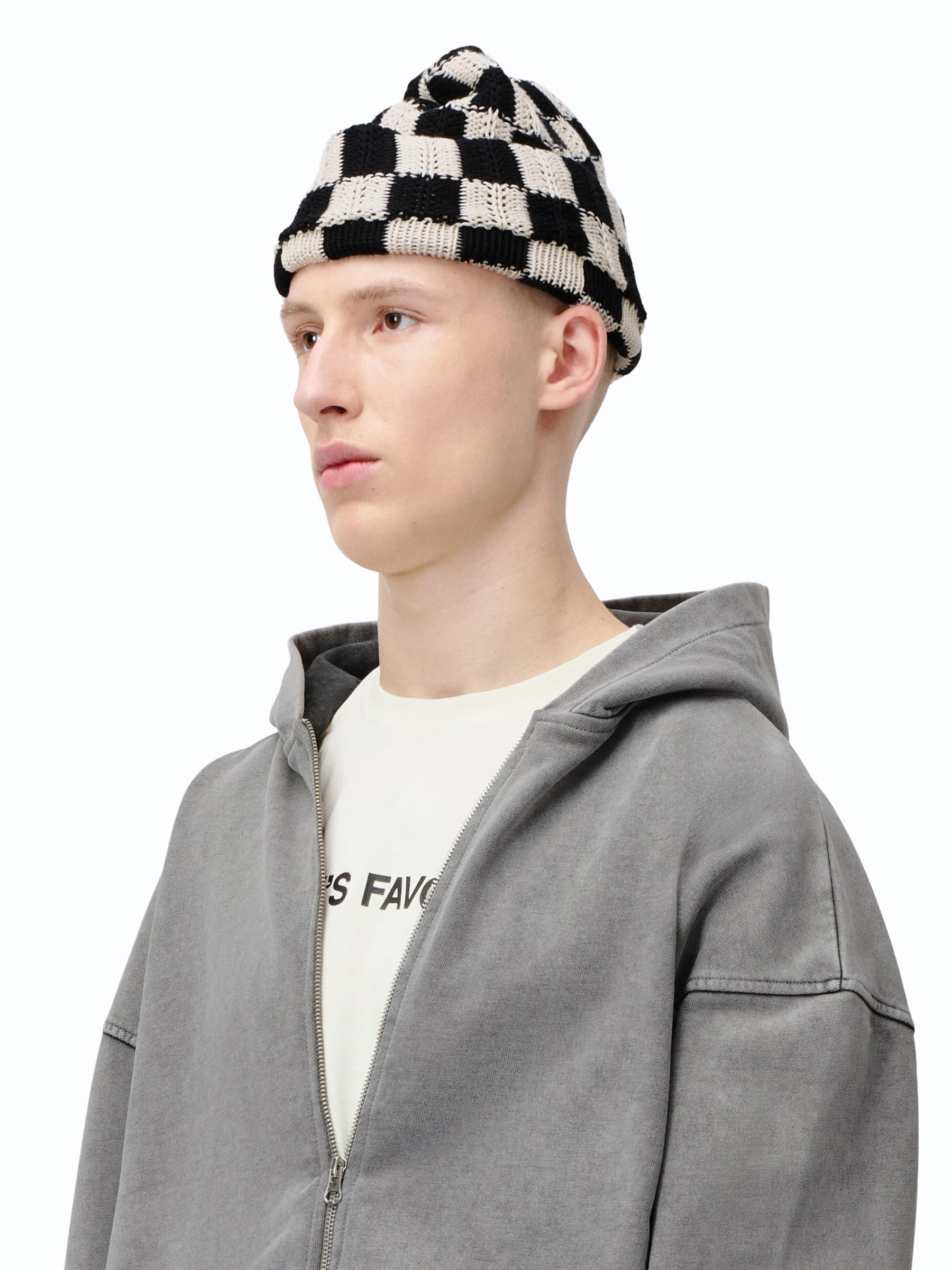 Gestrickte Checkerboard-Beanie. Schwarz/Weiß. Braun/Weiß. Navy/Weiß.