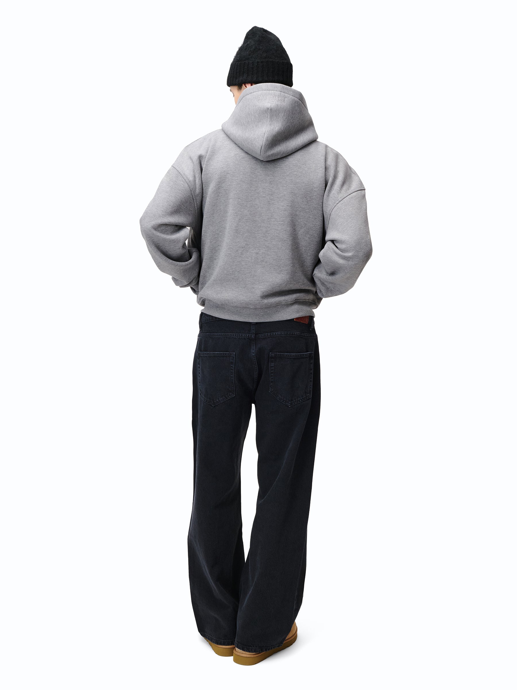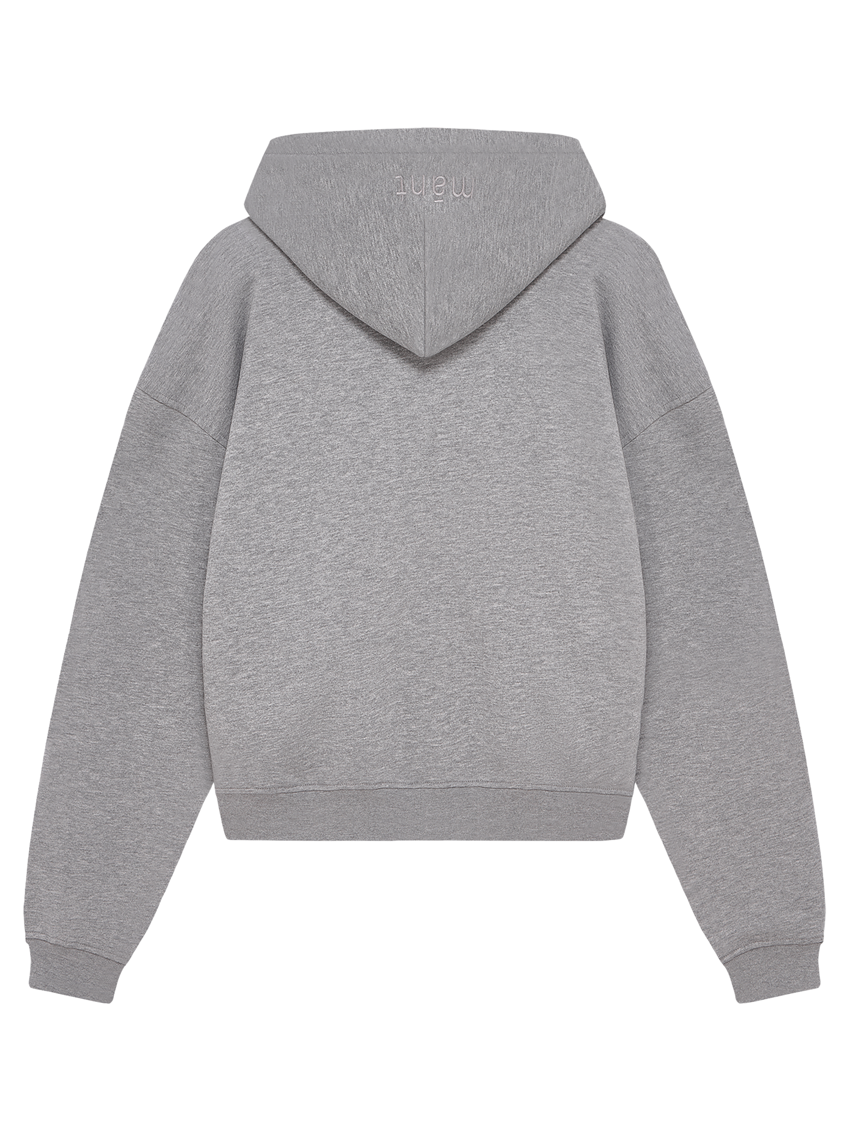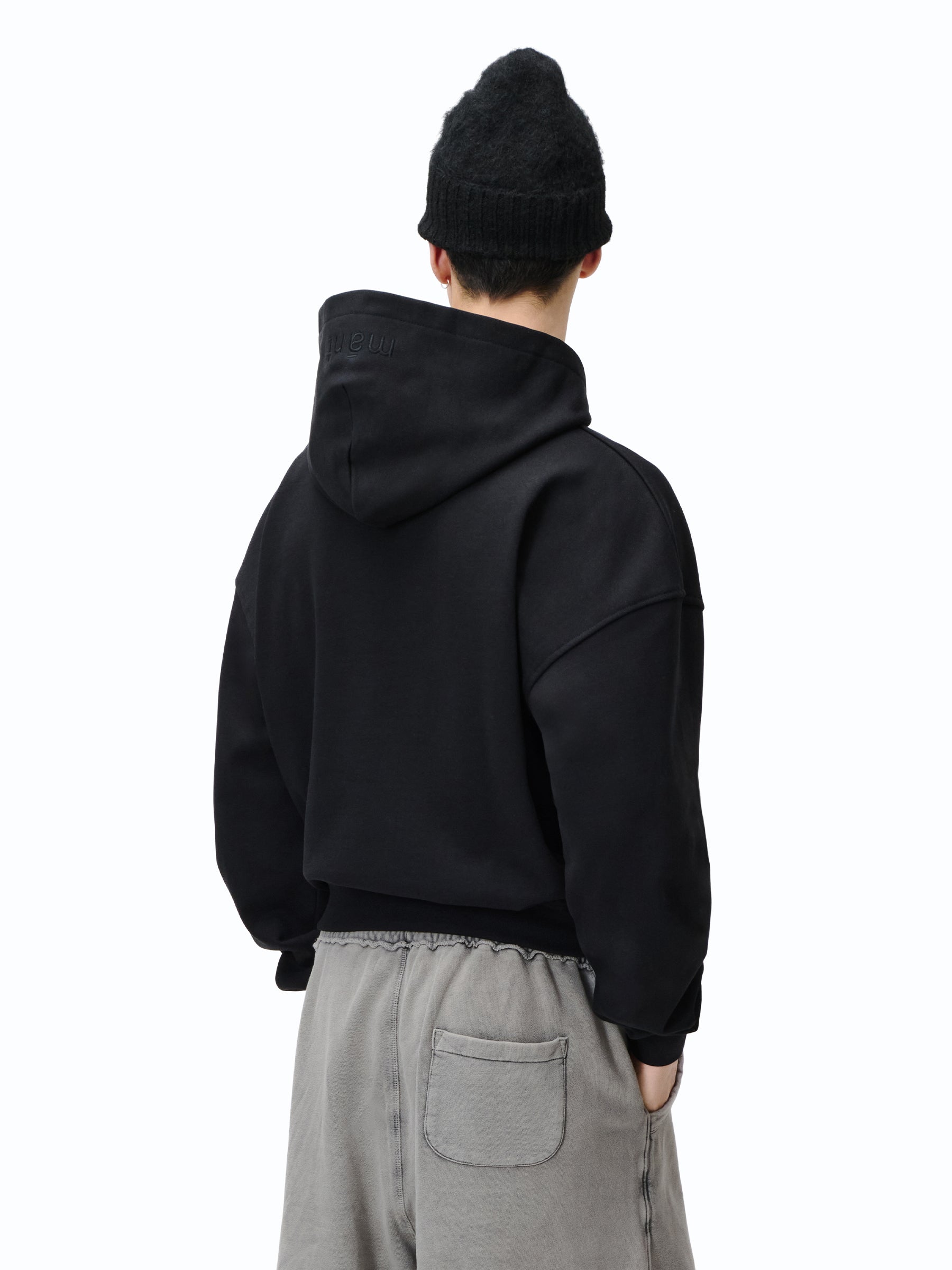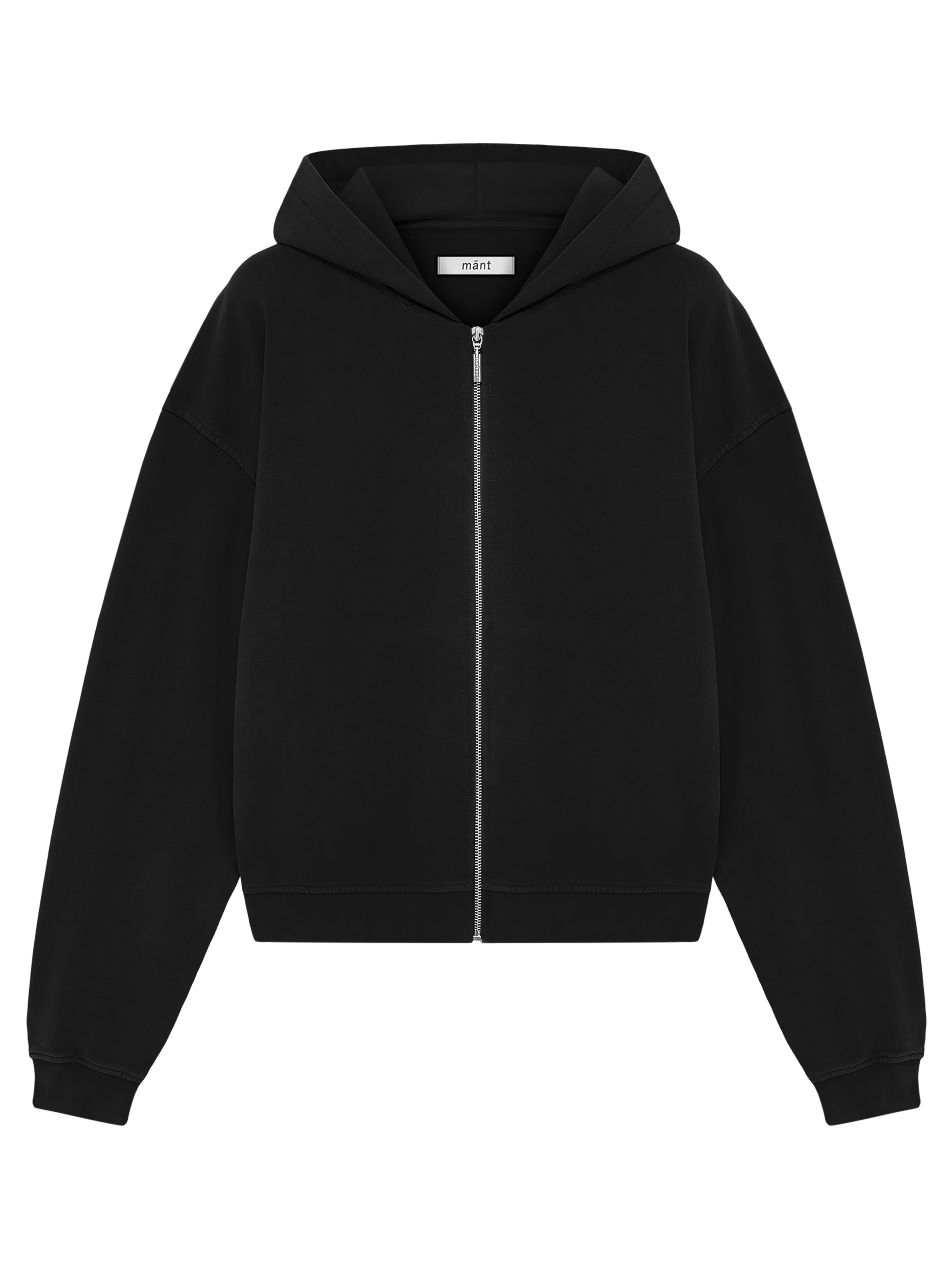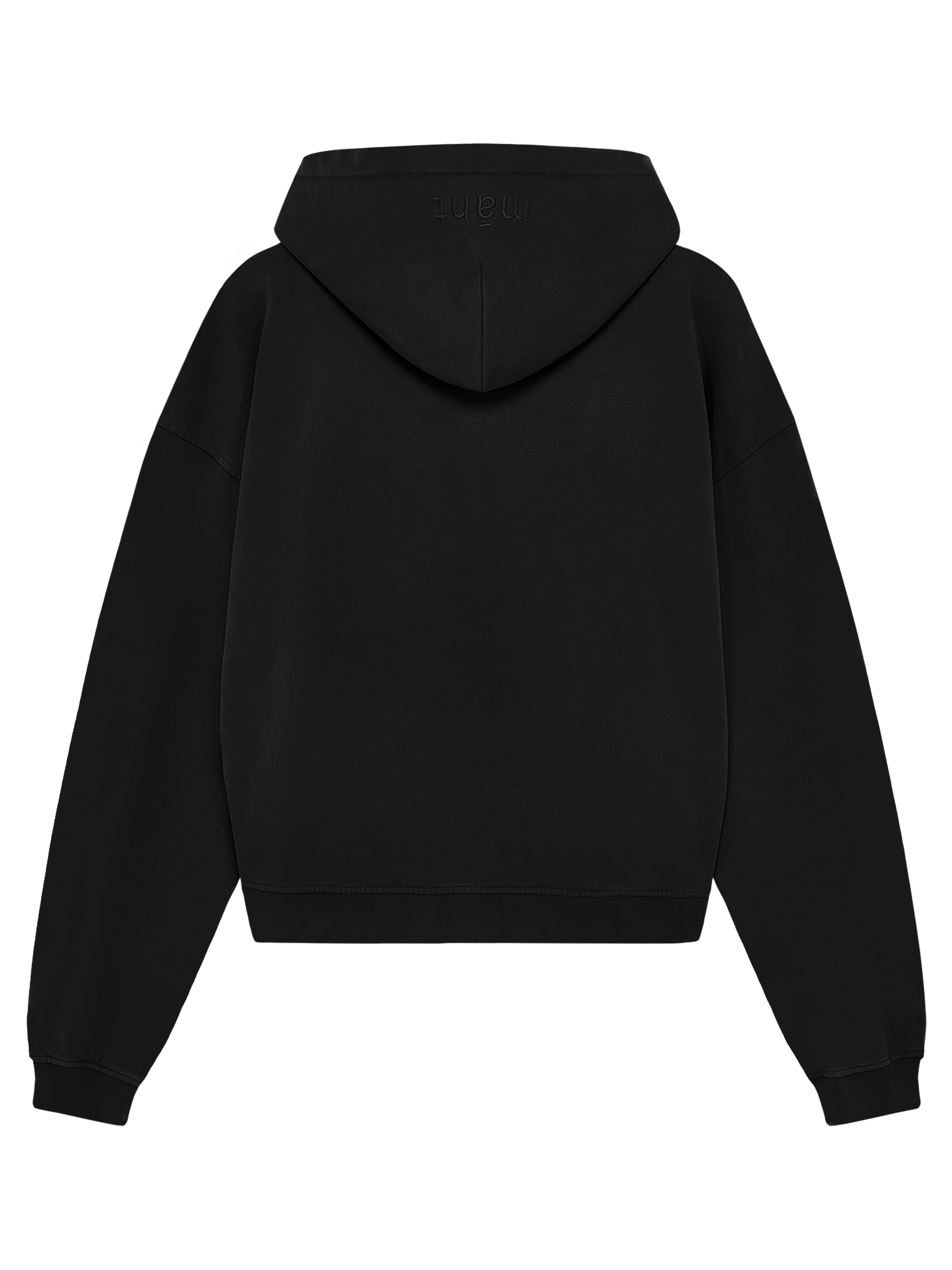 Zip Hoodie in schwarz & grau mit „mánt“-Stickerei auf der Kapuze.