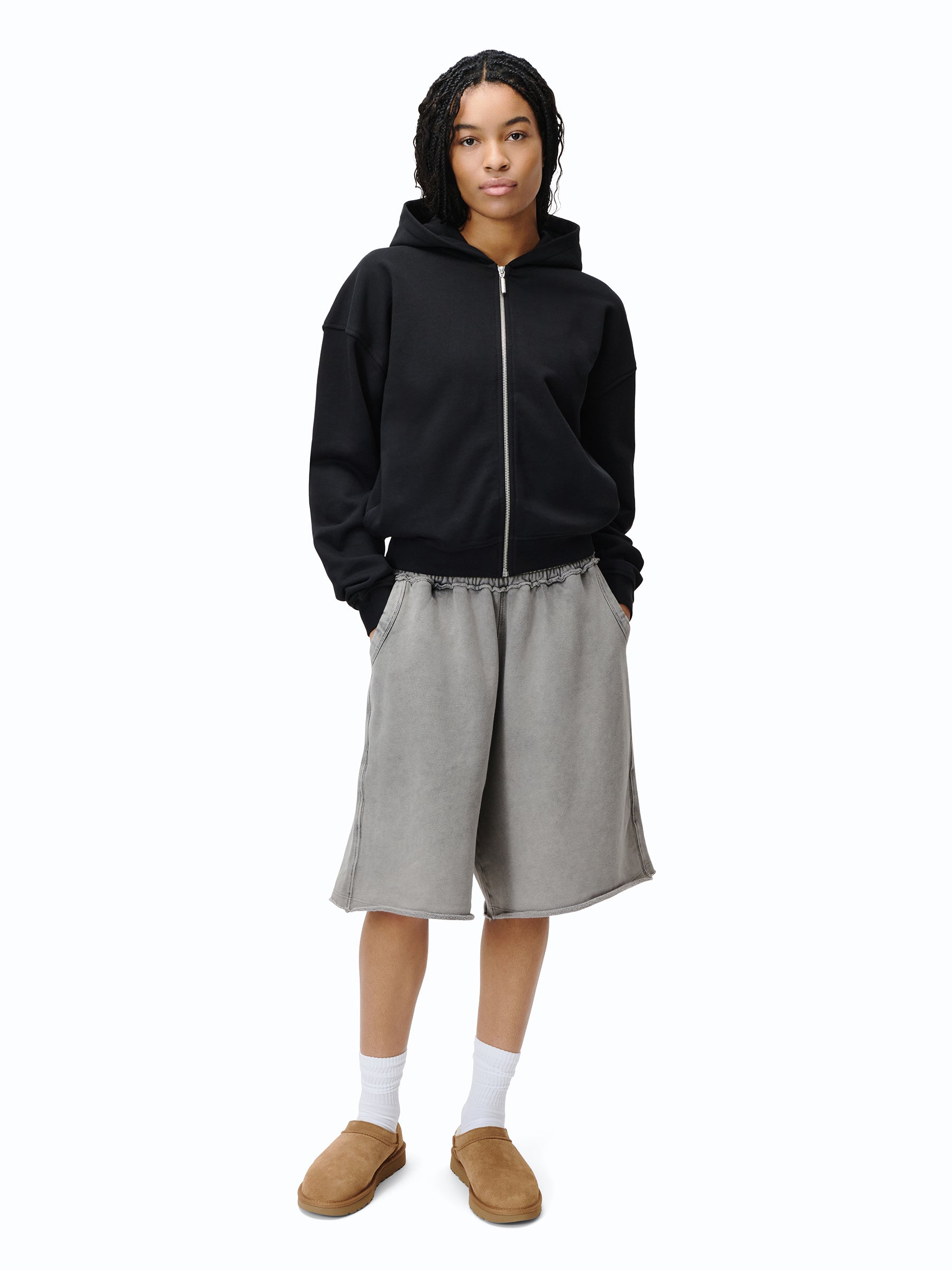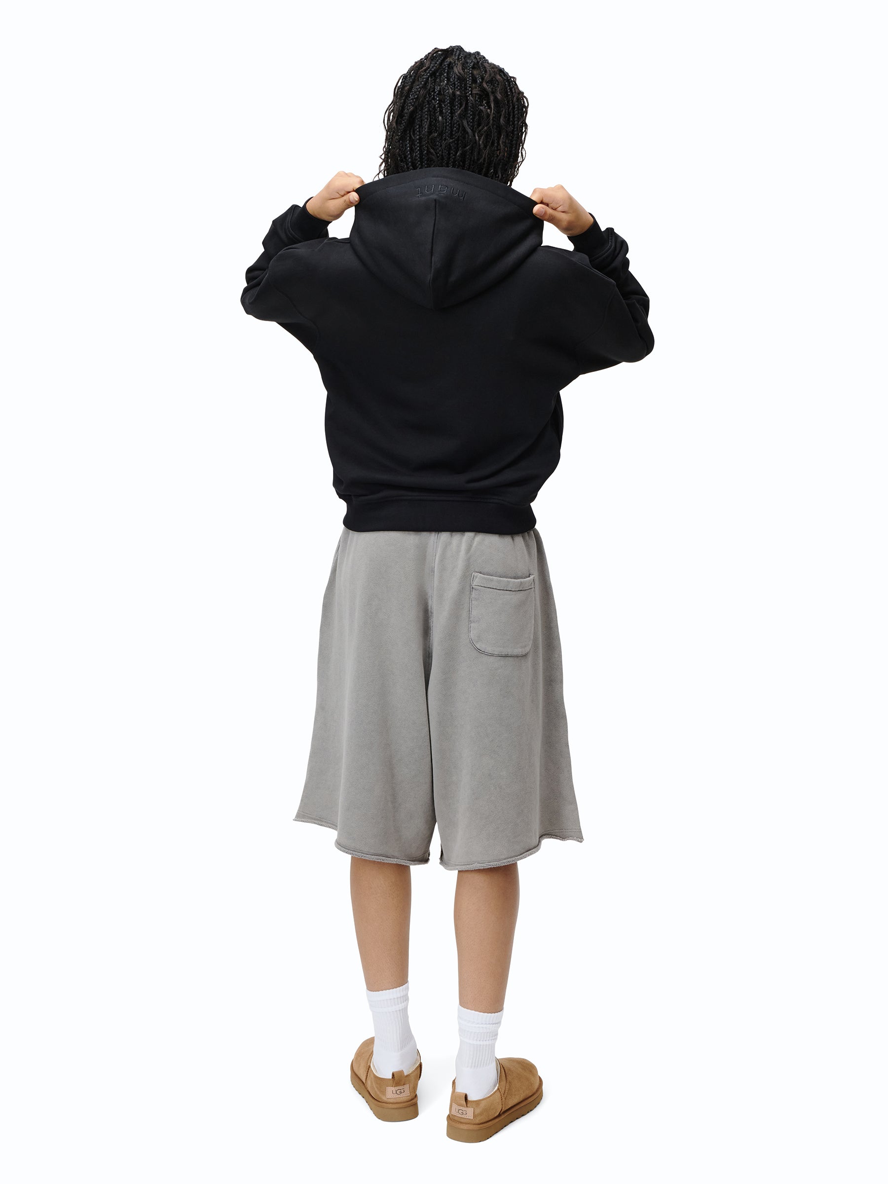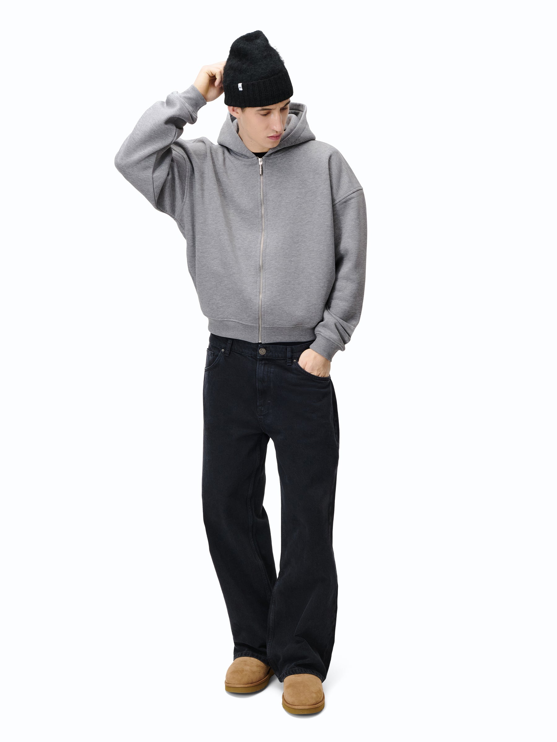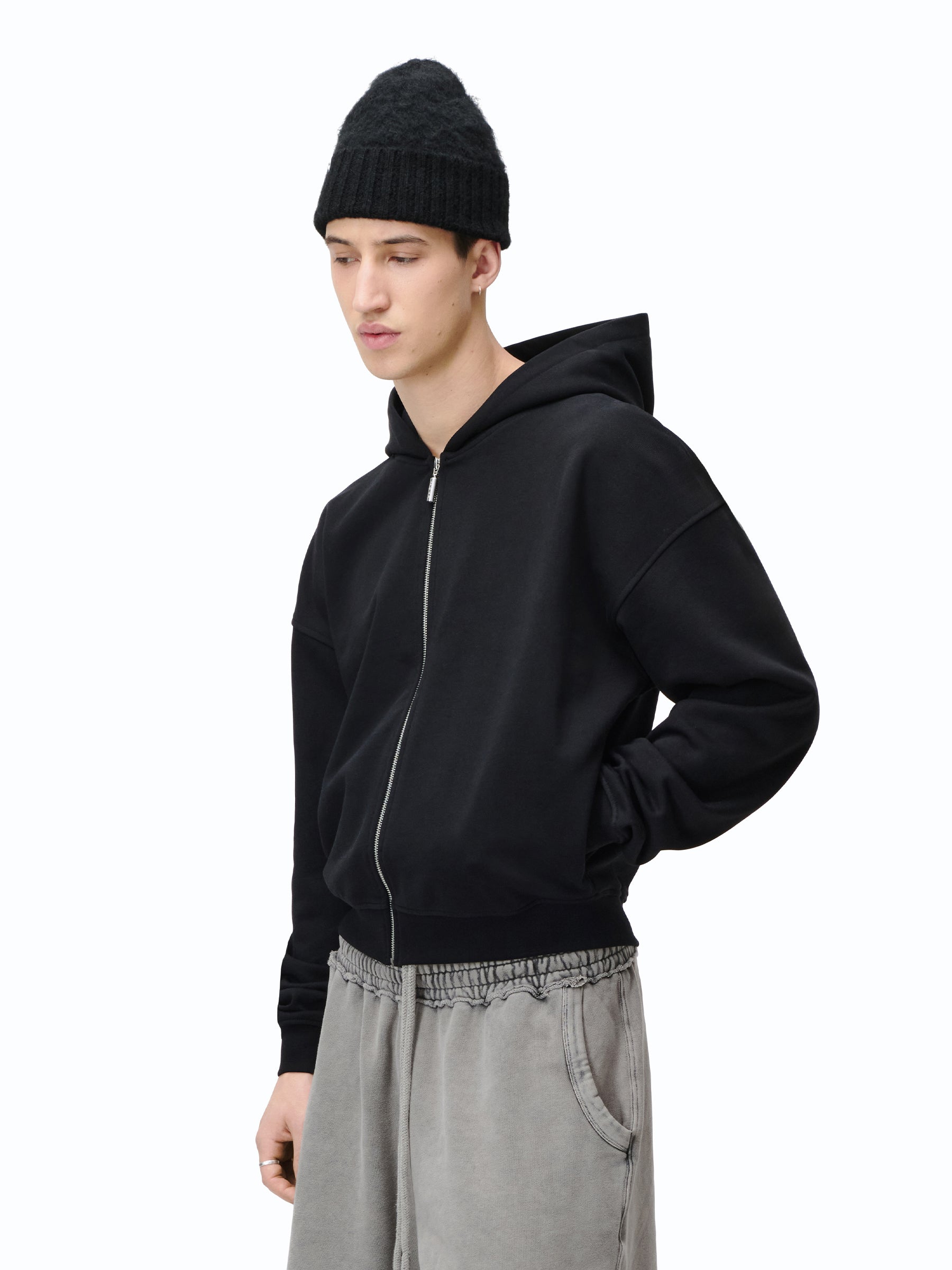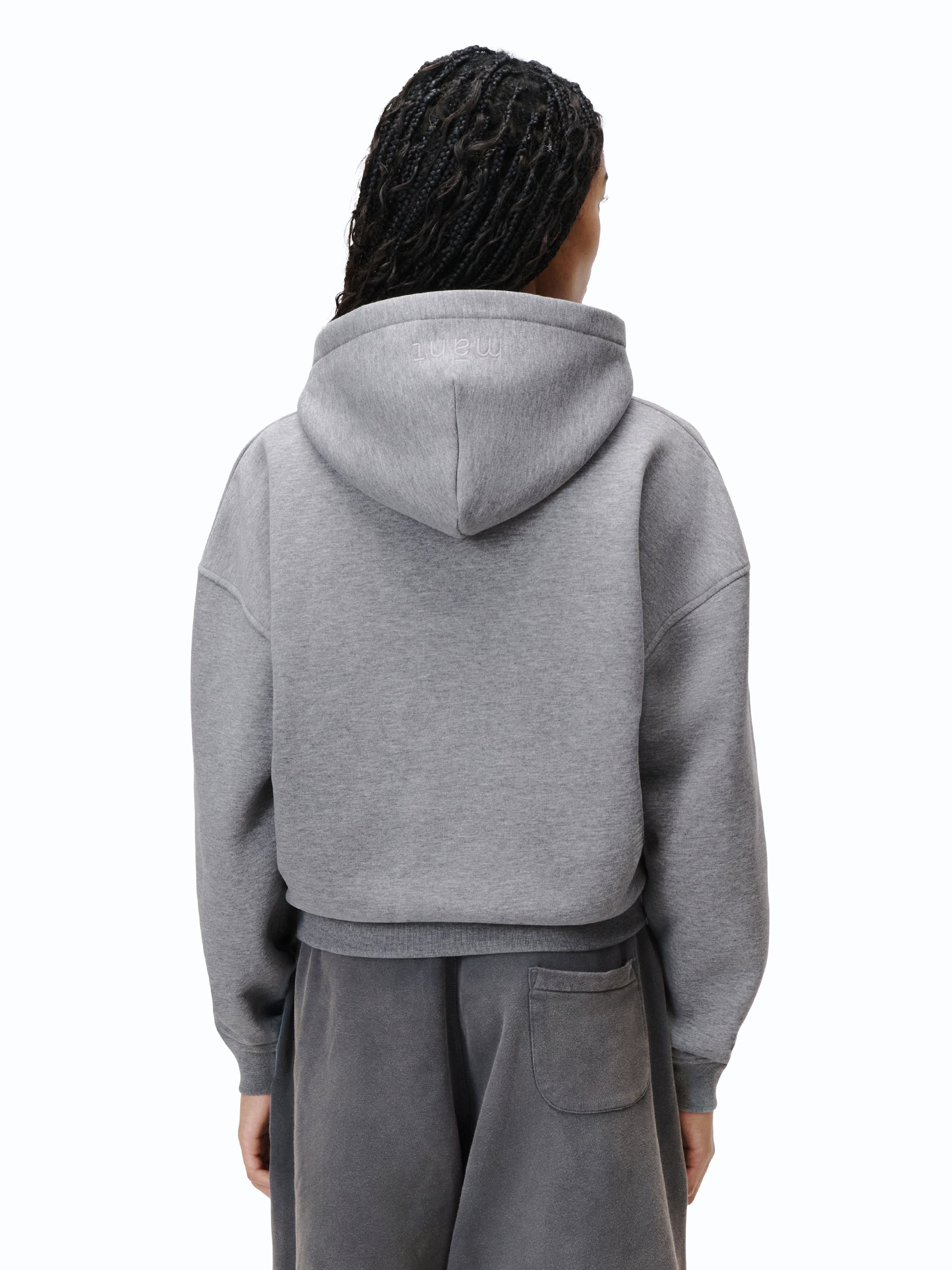 Zip Hoodie in schwarz & grau mit „mánt“-Stickerei auf der Kapuze.