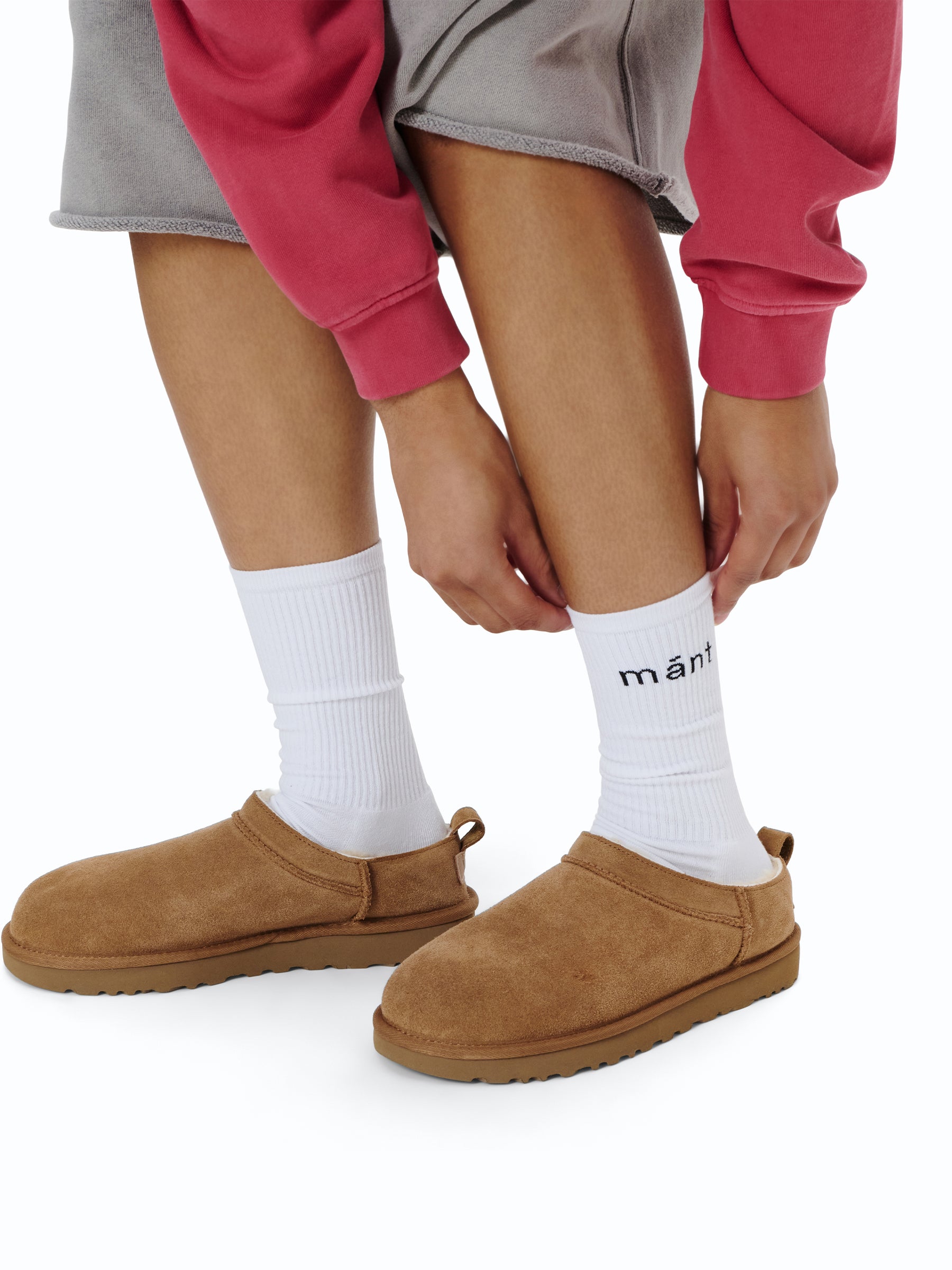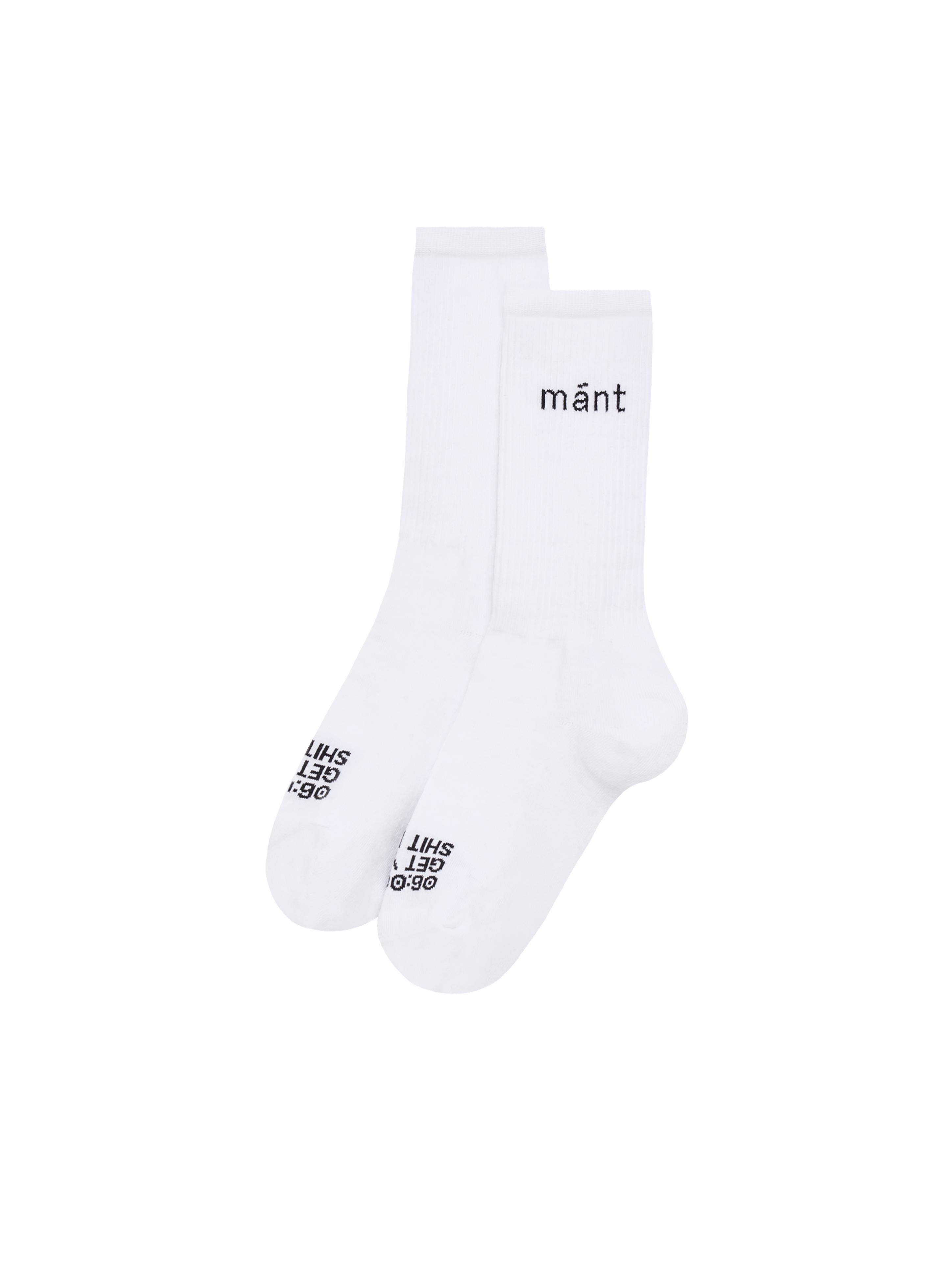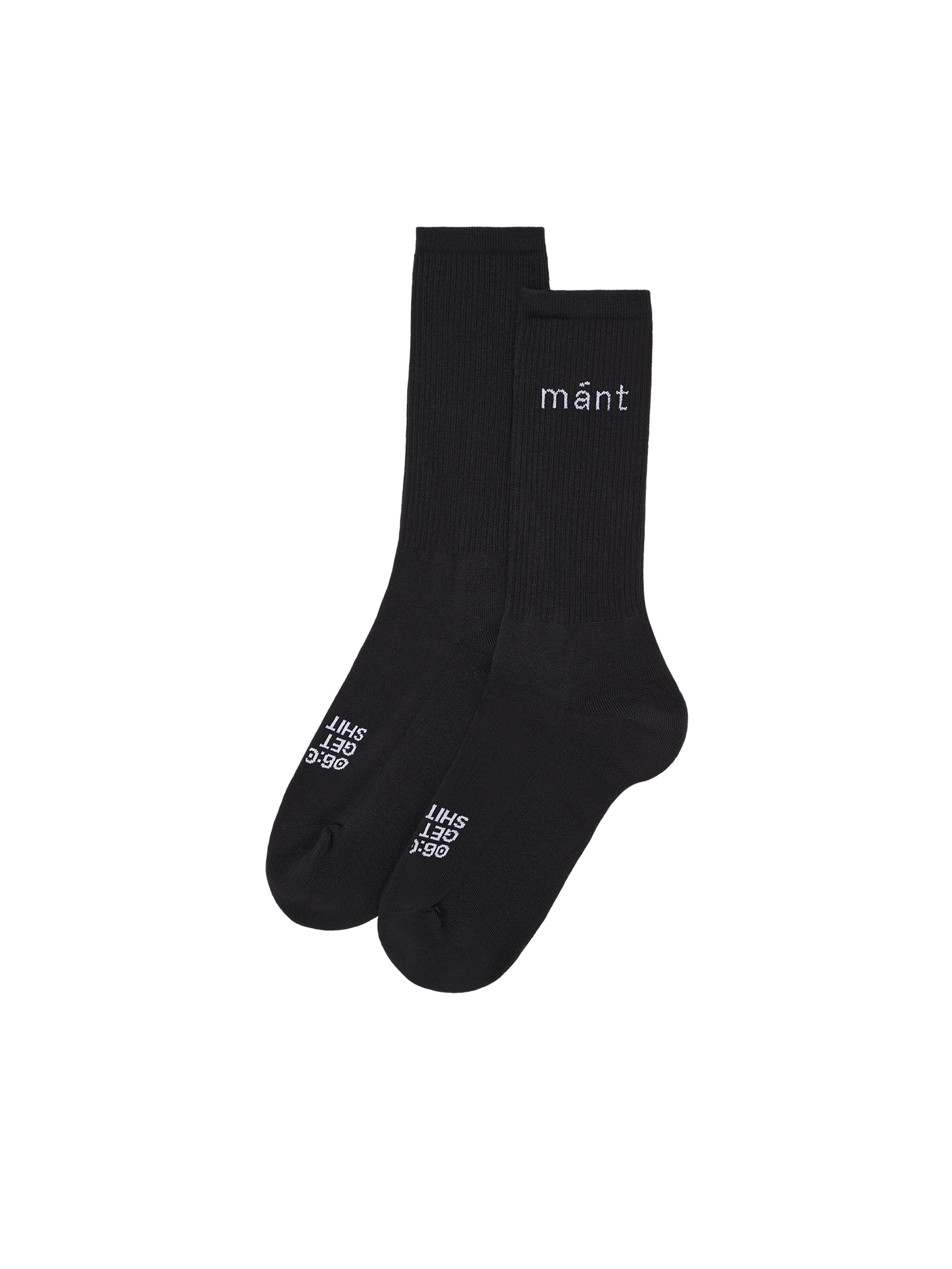 Socken in schwarz & weiß mit "mánt" Logo und Spruch.